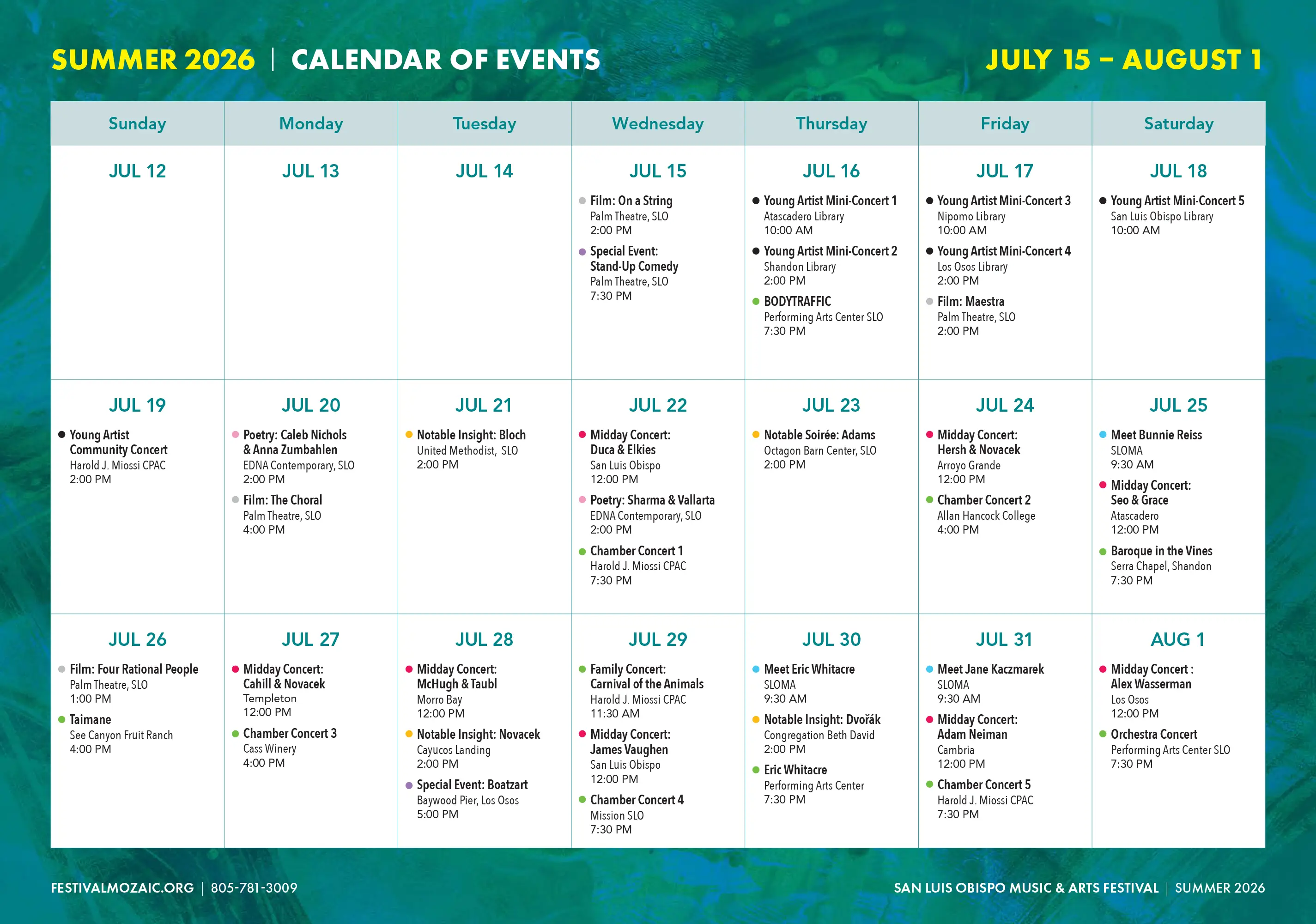 ↵When you package your tickets to multiple events during the Summer 2026 San Luis Obispo Music & Arts Festival, you get access to the best seats at the lowest prices! Packages must be purchased by phone at (805) 781-3009. Single tickets can be purchased online starting April 23.